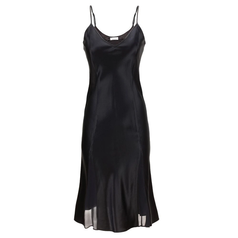 Kurzes Seiden- Nachthemd KLASSIK mit halb- transparenten Einsätzen aus Seiden- Georgette im Rock. Dieses luxuriöse Seidennachthemd mit feinem Spaghetti – Träger ist aus hochwertigem 19 momme Seidensatin. Die transparenten Keil- Einsätze im Rock lassen den Saum raffiniert schwingen. Die Länge ist ca. 95 cm.