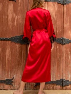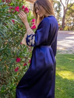 Ein langer Morgenmantel der Luxusklasse ist der Seiden-Morgenmantel Marjolie No. 9 der französischen Edel-Marke Marjolaine. Der edle Seidensatin aus reiner Seide wurde mit exquisiter Calais Spitze zu einer aufregenden Nachtwäsche verarbeitet.
