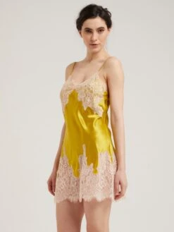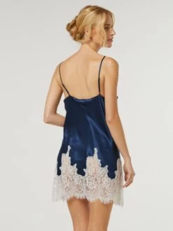 Das kurze Seidennachthemd hat fein gearbeitete in der Länge verstellbare Spaghetti-Träger und ist in der Farbe nachtblau, gold oder oceantürkis mit Spitze erhältlich.