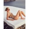 Dieser mondäne Badeanzug von Fürstenberg überzeugt durch seinen modischen Druck mit Blätter-Muster und die ausgefallene Farbstellung in grün, gold, schwarz und hellblau.