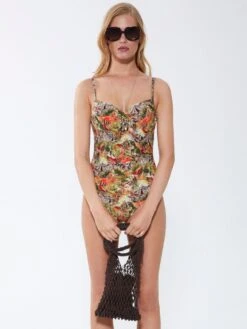 Dieser zeitlose Badenanzug von Fürstenberg überzeugt durch seinen modischen Druck und die exklusive Farbstellung in apricot mit grün. Der Badeanzug hat ein verführerisches Muster mit Zebras, Leopard und Palmenblättern und ist leicht assymetrisch gestaltet, mit seitlicher Raffung.