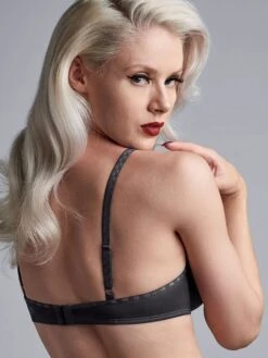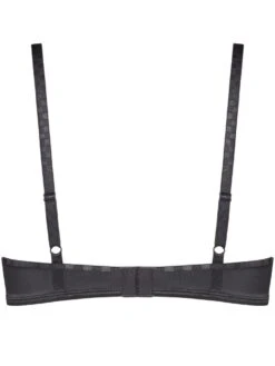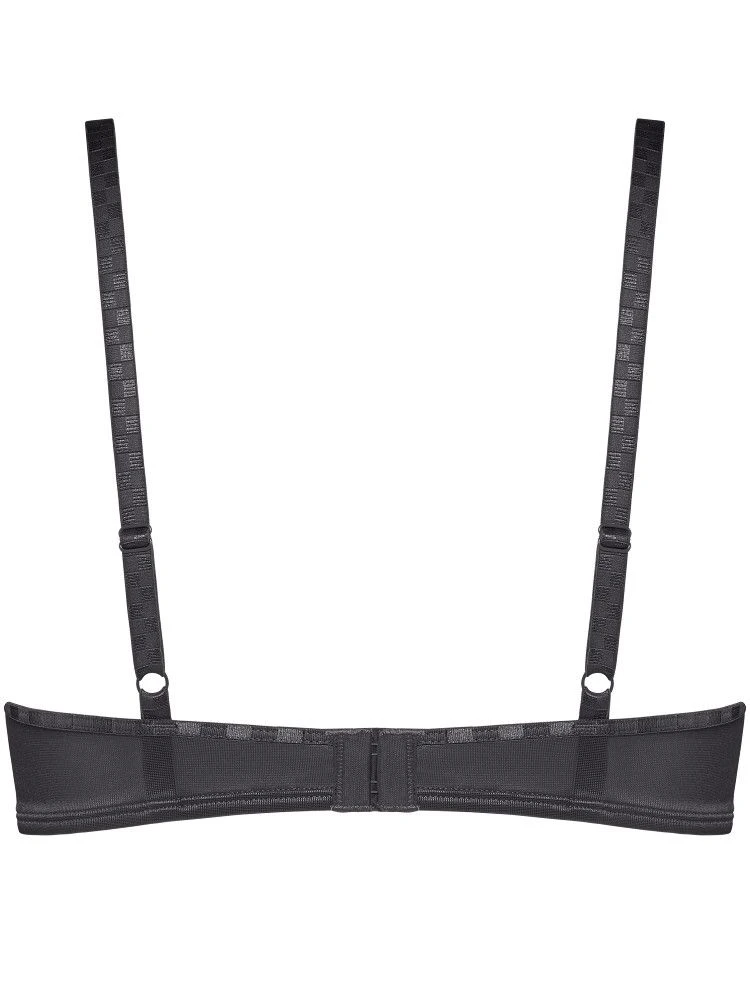 Der BH hat ausgeformte, gefütterte Halb Schalen-Cups. Die Schalen mit Bügel sind auf der Außenseite grau kariert und innen in einfarbig grau abgefüttert. Die Seitenteile des BHs bestehen aus elastischem Jersey und auf der Rückseite wird der BH mit einem doppelten Häkchenverschluss (dreifach verstellbar) geschlossen. Die Träger sind elastisch und in der Länge verstellbar und über den Cups hat der BH die für die Marke typischen Bändchen.