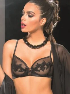 Der Spitze Bügel-BH Scarlett aus der limitierten RC Private Collection „Black Mirror“ von RCrescentini besteht aus elastischer, schwarzer Spitze und Tüll. Die Cups mit Bügel sind nicht gefüttert und daher transparent. Die elastischen Satin-Träger sind auf der Rückseite in der Länge verstellbar. Der BH wird im Rücken mit einem 4-fach verstellbaren, doppelten Häkchen Verschluß geschlossen.