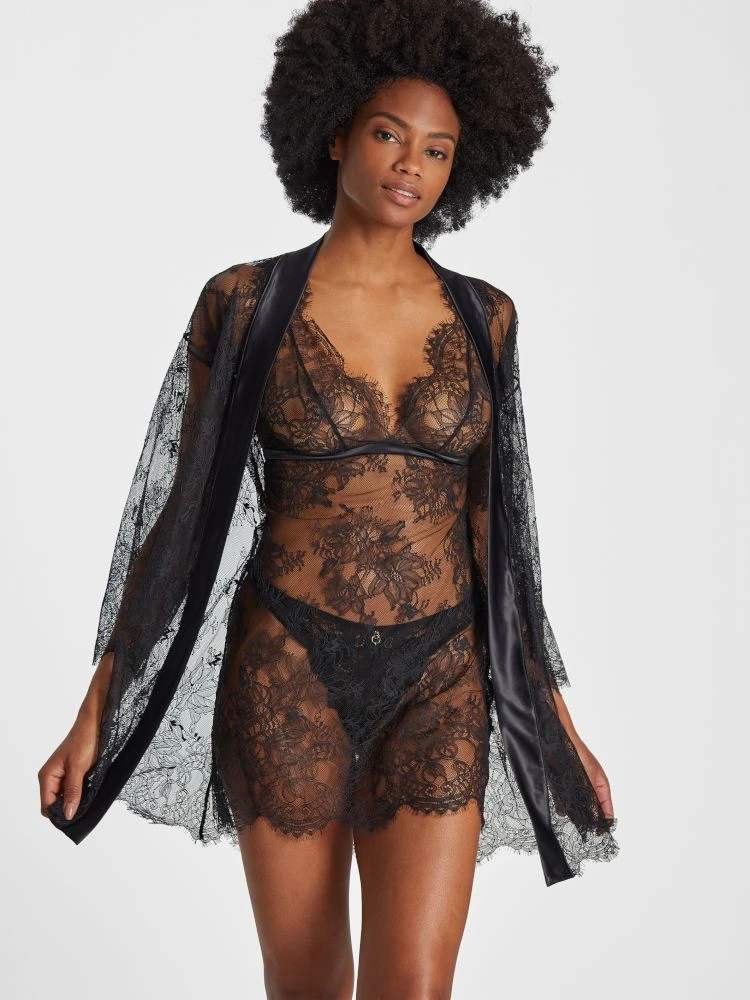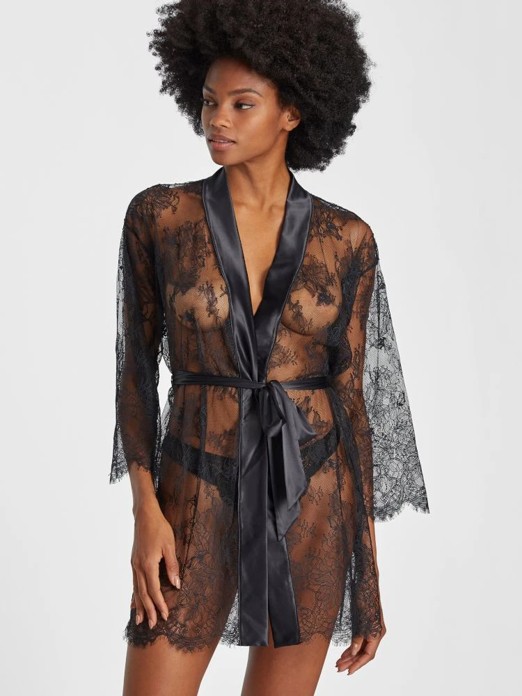 Der sinnliche Morgenmantel aus transparenter Eye-Lash Spitze hat aufgrund des Kimono Schnitts breite, trompetenartige Ärmel und einen Gürtel. Der Ausschnitt des Kimonos ist in schwarzes Satin eingefasst und somit aus dem gleichen Stoff wie der abnehmbare Gürtel. Er ist etwa 85cm lang und reicht bis zur Mitte des Oberschenkels. Das edle Satinband um der Taille definiert den Körper und seine Kurven und verleiht dem Mantel einen luxuriösen Touch.