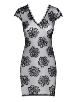 Das kurze, schwarze Lingerie Kleid von Cadolle ist ein eleganter Hauch von Nichts… Es besteht aus transparentem, schwarzem Tüll, welcher mit einem Flock-Velour Blumenmuster bedruckt ist. Das Kleidchen ist ungefüttert und daher transparent. Es hat kurze Ärmel und Spitzenverzierungen am Ausschnitt.