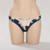 Die schwarzen Strings werden von einem kleinen Streifen schwarzem Tüll zusammengehalten, den eine große gestickte Blüte in warmem gold-sand und puder-beige schmückt. Die Übergänge zu den seitlichen Strings sind mit kleinen Blüten mit anhängenden Kettchen verziert, welche mit einem funkelnd gelbem Strass-Stein dekoriert sind.