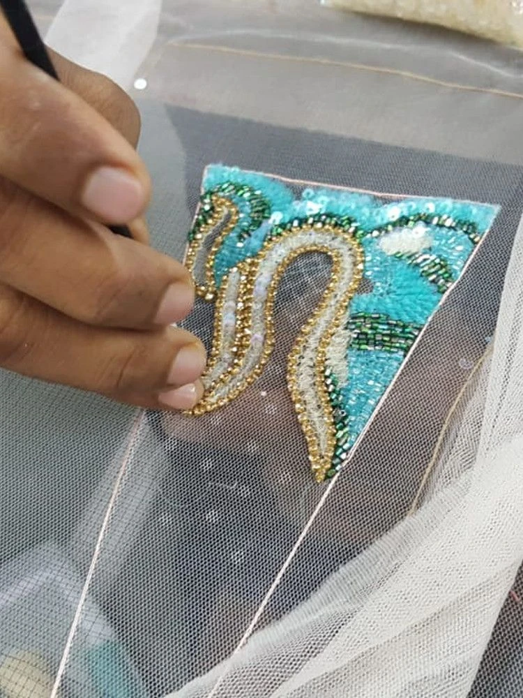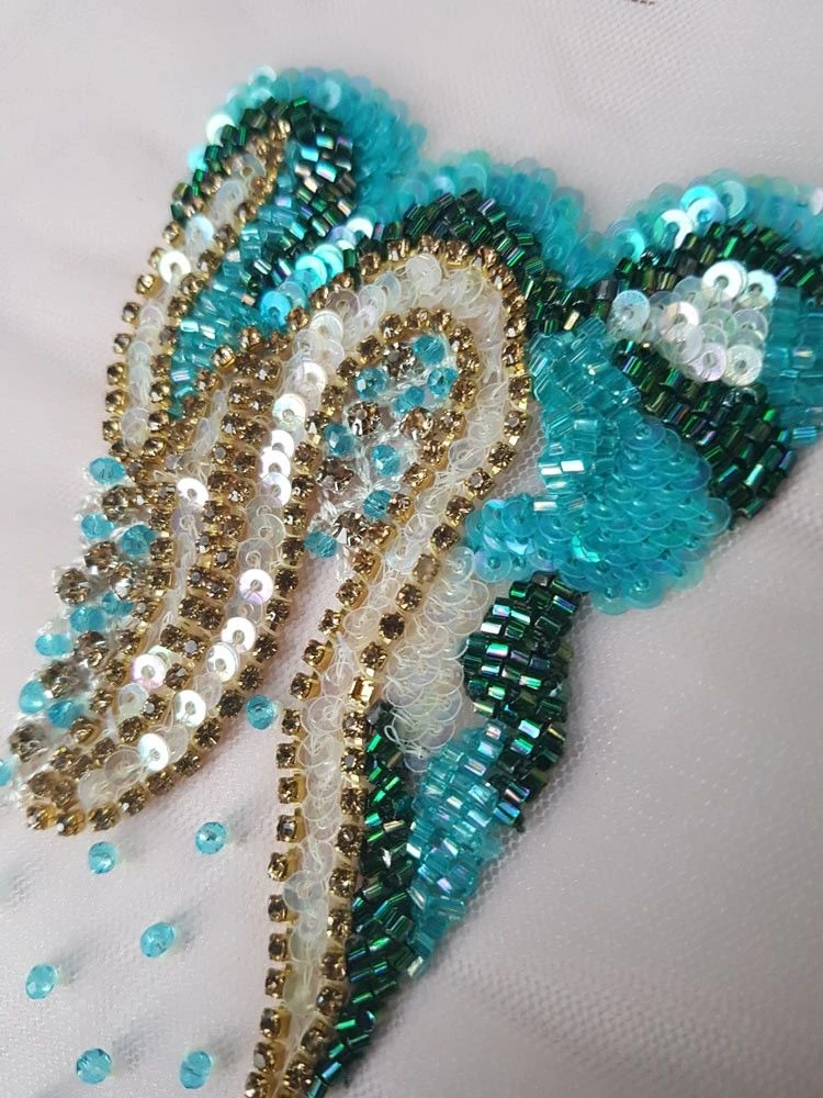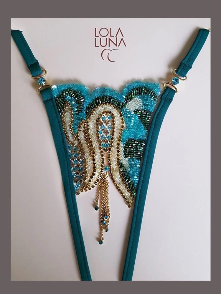 Im oberen Bereich besteht der String aus handbesticktem TĂĽll mit orientalischem Muster. Ein zierliches Schmuckelement aus goldenen Kettchen und blauen Kristallen ziert den offenen Schritt. Die Ăśbergänge zu den seitlichen Bändern tragen goldene Schmuckspangen mit tĂĽrkisfarbenen Kristallen. Die aufwendig handbestickten Pailletten bilden ein Muster wie aus „Tausendundeine Nacht“.