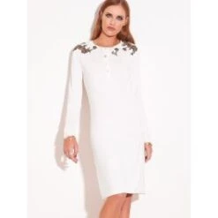 Das kurze Nachthemd von Chiara Fiorini besteht aus weichem Micro-Modal in einer hautsympathischen, elastischen Jersey-Qualität (95% Modal, 5% Elasthan). Der Stoff fällt fließend und schmiegt sich schön an den Körper an. Er ist Made in Italy und in den Größen 34 bis 48 erhältlich. Dieses Nachthemd hat eine Gesamtlänge von ca. 95 cm (bei Größe 1) und hat lange Ärmel. Der Ausschnitt dieses Nachthemdes ist rund mit Knopfleiste und einem beigefarbenem Saum. Der Schulter- und Dekolettébereich ist mit tüllbestickter Blütenspitze in braun und beige verziert.