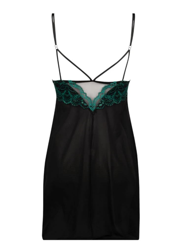 Das bezaubernde Negligé gibt es in der Farbe Noir Vert, einem edlen schwarz mit schimmerndem Türkisgrün. Das kurze Nachthemd ist in den Größen 36 bis 46 erhältlich.
