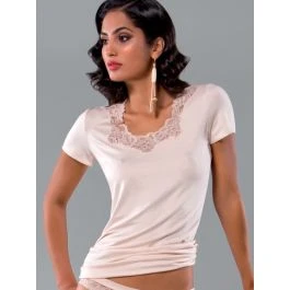 Das Pyjama Top Ruscella in T-Shirtform hat einen Rundhalsausschnitt, welcher mit Blumen aus Spitze verziert ist. Das zarte Nachtshirt ist mit einer Länge von ca. 70 cm länger geschnitten und ist zudem vorne ein Stück kürzer als hinten.