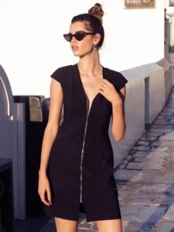 Dieses Reisekleid der französischen Luxus Beachwear Marke Pain de Sucre ist ungefähr 95 cm lang und in zeitlos elegantem Schwarz zu haben. Es ist ungefüttert und in den Größen 36 bis 42 (deutsche Damengrößen) erhältlich. Dieses kurze Kleid ist vielseitig zu tragen, und daher besonders praktisch auf Reisen: es kann als Sommerkleid, Businesskleid oder Strandbekleidung verwendet werden.