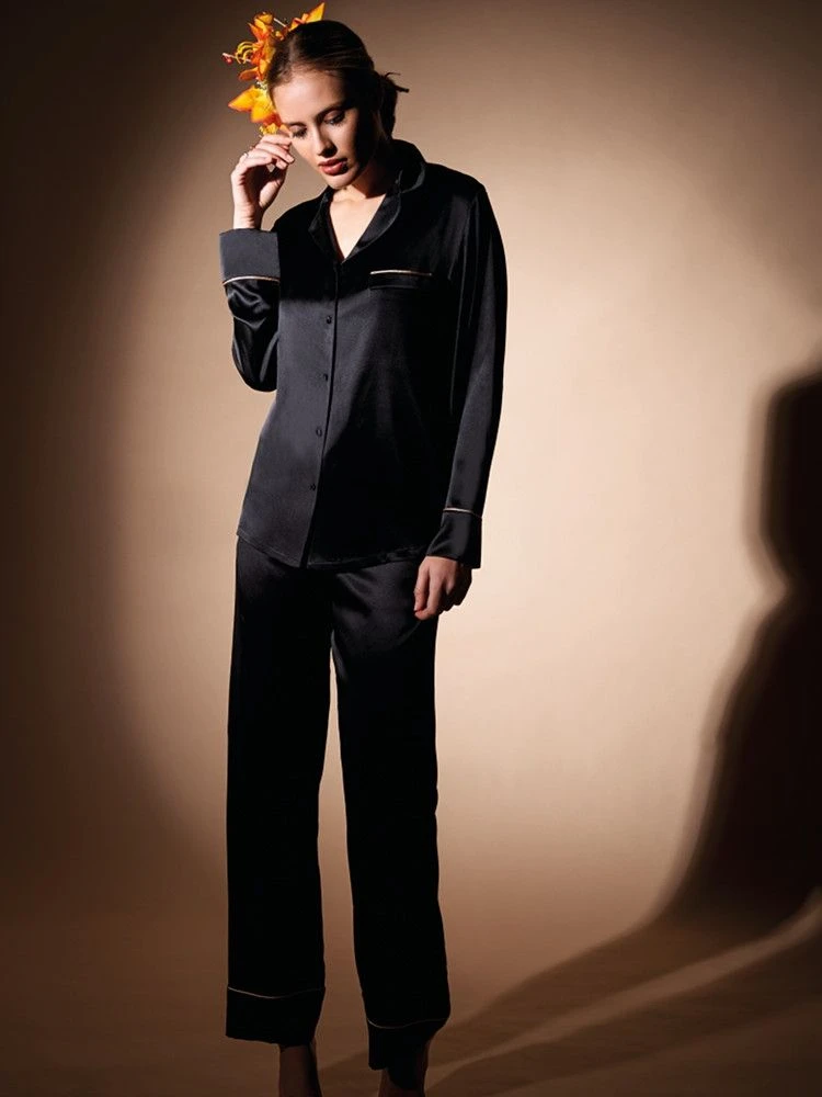 Dieser exclusive Seidenschlafanzug ist ein Teil aus der limitierten Weihnachts-Serie „Christmas Capsule“ von Chiara Fiorini. Er ist in schwarz mit creme-weißen Biesen erhältlich. Das Material ist fein, weich und glänzend.