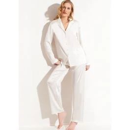 Der Pyjama mit langen Ärmeln von Chiara Fiorini besteht aus Seide in einer elastisch gewebten Qualität (96% Seide, 4% Elasthan). Er ist Made in Italy und in den Größen 34 bis 52 erhältlich. Dieser klassisch geschnittene Schlafanzug hat ein durchgehend geknöpftes Oberteil mit langen Ärmeln und eine Hose mit Gummibund und Bindebändchen. Die Knöpfe des Oberteils sind mit Stoff bezogen und auf der Brust ist eine Tasche aufgenäht.