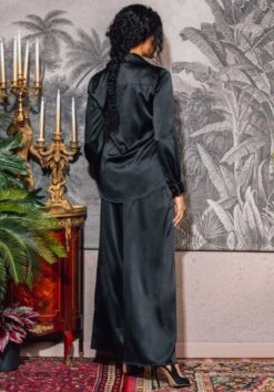 Dieser Luxus Seidenschlafanzug hat eine durchgehende Knopfleiste und Manschetten mit Knopf an den Ärmelenden. Er ist in farngrün, schwarz oder jeansblau erhältlich. Das Oberteil ist ca. 65 cm lang.