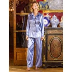 Der lange Seidenpyjama Oxana der französischen Luxus-Marke Marjolaine ist aus glänzendem Seidensatin (Stretchseide mit 92% Seide, 8% Elasthan) gefertigt. Das edle Material fällt weich und fließend und ist angenehm auf der Haut. Der Satinstoff glänzt elegant und ist in modischen Farbtönen zu haben.