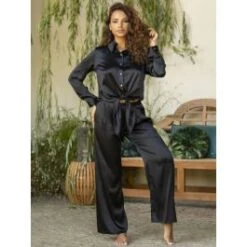 Dieser Luxus Seidenschlafanzug hat eine durchgehende Knopfleiste und Manschetten mit Knopf an den Ärmelenden. Er ist in kobaltblau, schwarz oder terrakotta braun erhältlich. Das Oberteil ist ca. 68 cm lang und wird vorne unten mit einem modischen Bindeknoten gebunden.