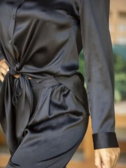 Dieser Luxus Seidenschlafanzug hat eine durchgehende Knopfleiste und Manschetten mit Knopf an den Ärmelenden. Er ist in kobaltblau, schwarz oder terrakotta braun erhältlich. Das Oberteil ist ca. 68 cm lang und wird vorne unten mit einem modischen Bindeknoten gebunden.