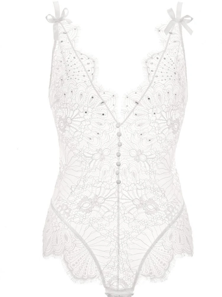 Der Body Crystal von Prelude Milano ist Spitzenwäsche Made in Europe. Das edle Teil besteht aus floraler Spitze und ist auf der Vorder- und Rückseite mit schwarzen Strasskristallen von Swarovski Crystals besetzt. Der Body ist nicht gefüttert und somit transparent. Im Rücken hat er einen Einsatz aus weichem Tüll und die Träger sind mit Satinschleifen verziert. Im Decollete ist eine Reihe zierliche Satinknöpfe angebracht.