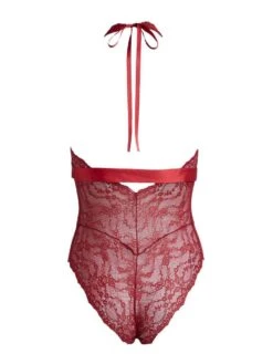 Dieser Body ist vorne und hinten aus feiner Blumen Spitze gefertigt und wird als Neckholder gebunden. Der Body hat Einsätze aus Tüll und ist mit einem kleinen goldenen Anhänger mit dem Escora Schlüssel verziert. Der Rücken ist tief ausgeschnitten und durch das Bindebändchen im Nacken kann die Größe etwas reguliert werden. Außerdem hat der Body einen Bindegürtel aus Satin beiliegend, der optional getragen werden kann. Der Body ist im Schritt mit Häkchen zu öffnen. Er ist ungefüttert und daher transparent.
