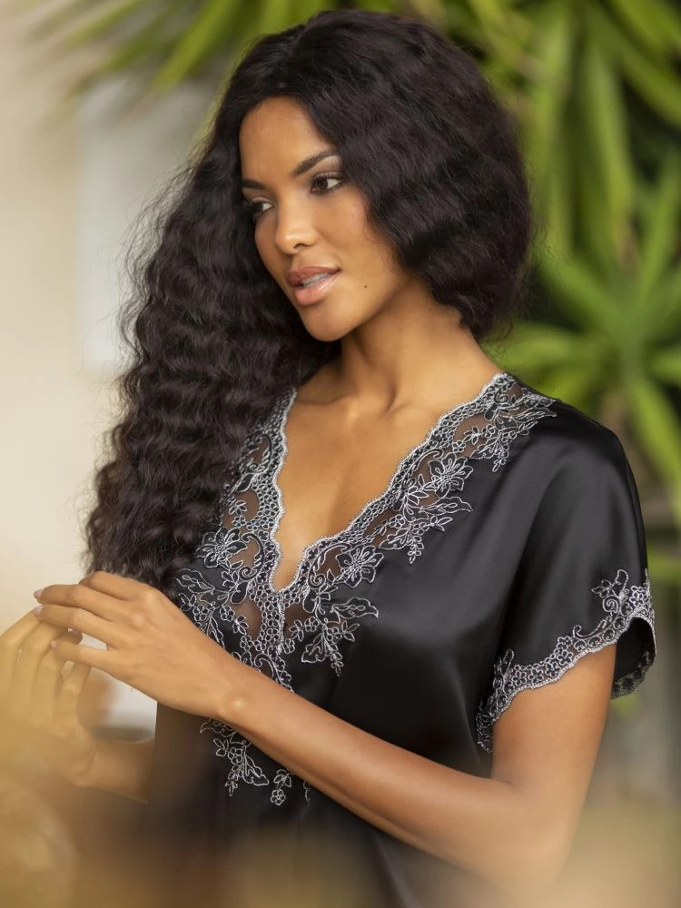 Ein Nachtkleid der Luxusklasse ist das Kurzarm Seide Nachthemd Reine der französischen Edel-Marke Marjolaine. Der edle Seidensatin aus 92% Seide und 8% Elasthan wurde mit exquisiter floraler Spitze (aus 100% Nylon) zu einer verführerischen Seidenwäsche verarbeitet.