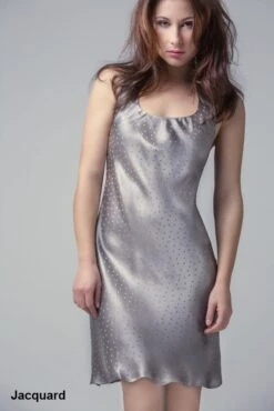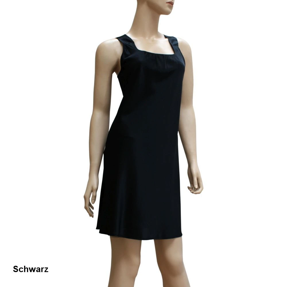 Kurz geschnittenes Nachthemd mit breiten Trägern (Länge ca. 90 cm) und Rücken im Ringershirt-Stil von Gattina Dessous. Das Seidennachthemd aus Stretchseide ist klassisch geschnitten mit leichter A-Linie für eine feminine Körperbetonung. Seidensatin fällt fließend und schmiegt sich weich und schmeichelnd um die Figur. In den Uni-Farben dieser Serie wird der Satin als Stretchseide verwendet – durch den Elasthan-Anteil von 5% wird der Tragekomfort verbessert. Die Teile mit Jacquard-Webmuster sind jedoch aus 100% Seide.