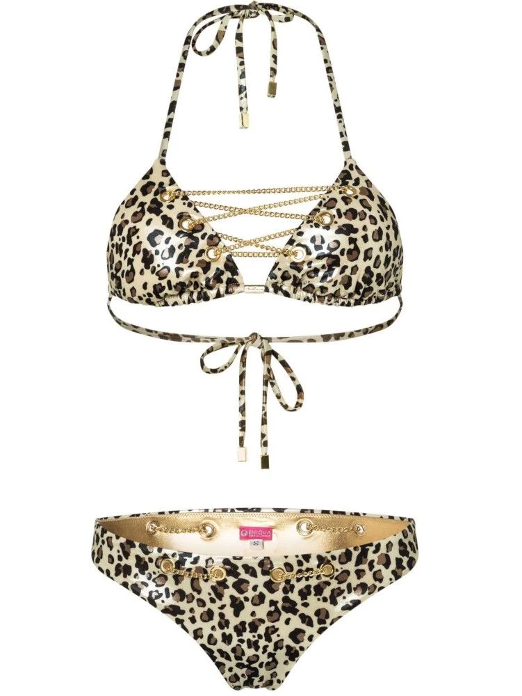 Der Triangel Bikini Lace Up Bound Leo ist luxuriöse Bademode von Eniqua. Die Bademode der schweizer Beachwear Marke Eniqua verführt mit besonders modischen Entwürfen und hochwertigen Materialien. Dieser hochwertige Bikini besteht aus einem weichem und schnell trocknenden Microfaserjersey und ist in aufregendem Leoprint gehalten. Goldener Lurex sorgt zudem für einen glänzenden Effekt. Ober- und Unterteil sind verziert mit goldenen Schmuckketten aus Metall im Schnürlook.