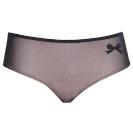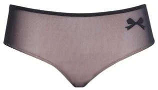 Dieser Tüll Slip besteht aus elastischem schwarzem Tüll (auf der Rückseite doppellagig), welcher vorne hautfarben unterfüttert ist. Ein kleines schwarzes Schleifchen ist vorne seitlich appliziert.