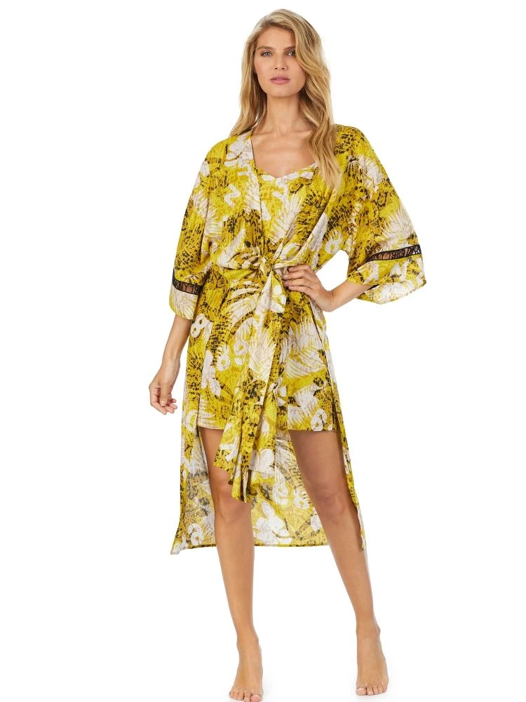 Dieser leichte Morgenmantel hat einen ausgefallenen Druck mit Palmblättern in Natur- und Beige-Tönen mit Sand-Gelb. Er ist für die warme Jahreszeit geeignet und kann als Homewear oder Beachwear getragen werden.