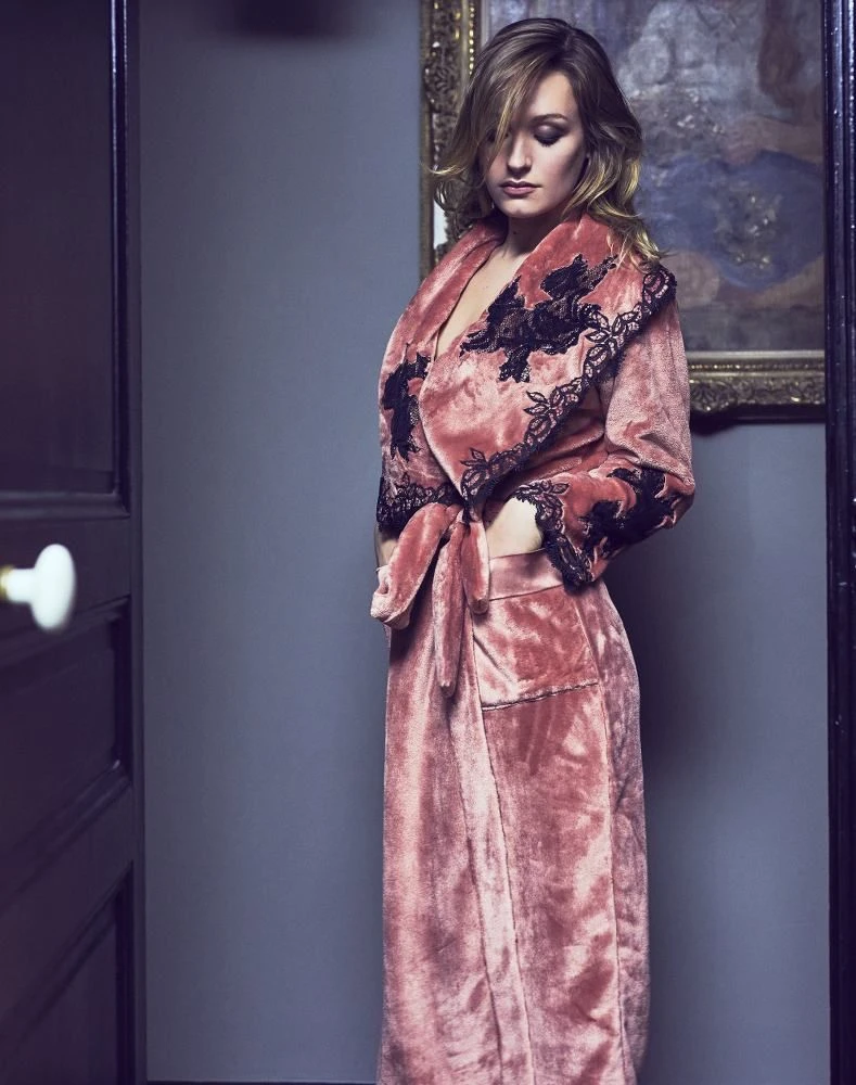 Der lange Morgenmantel Freda der französischen Luxus-Marke Marjolaine ist aus flauschig-weichem Teddy-Plüsch (100% Polyester) mit üppigem Spitzenbesatz am Revers und den Ärmeln gefertigt.